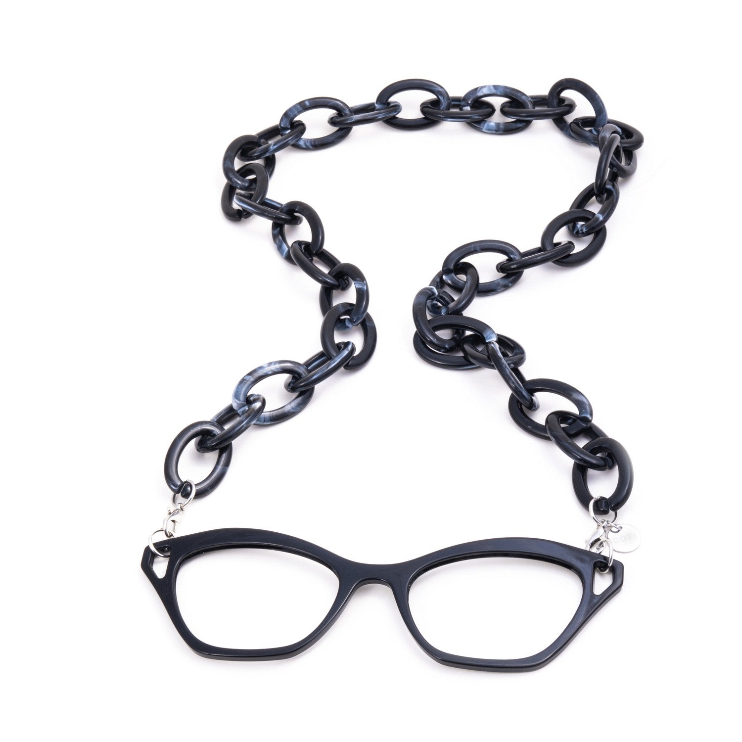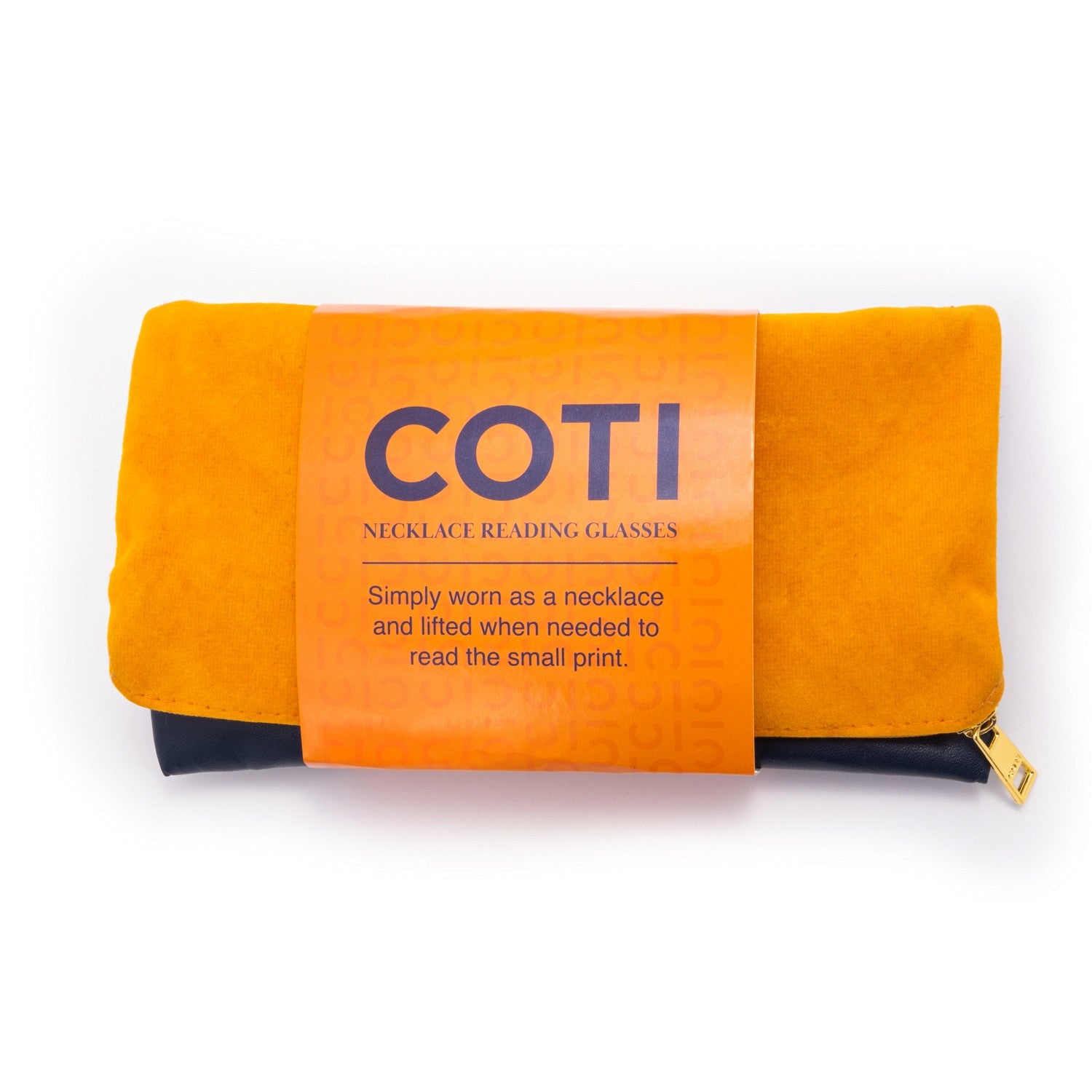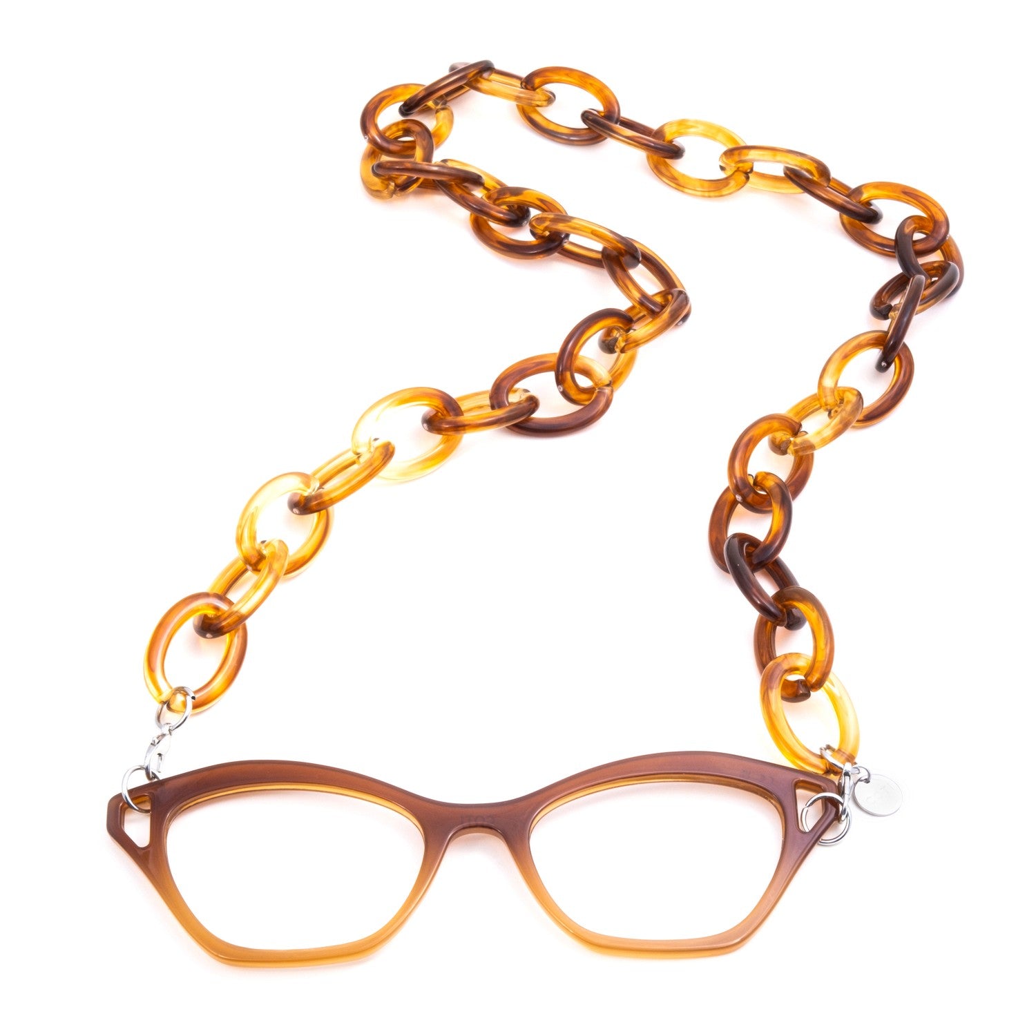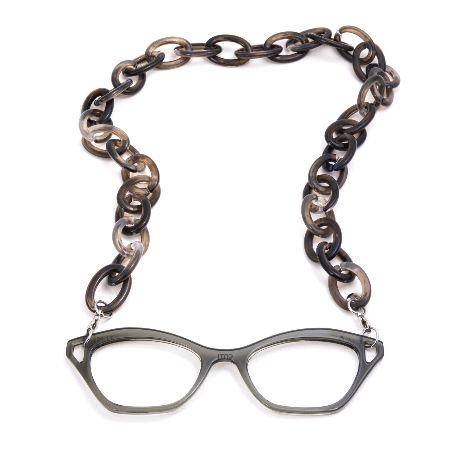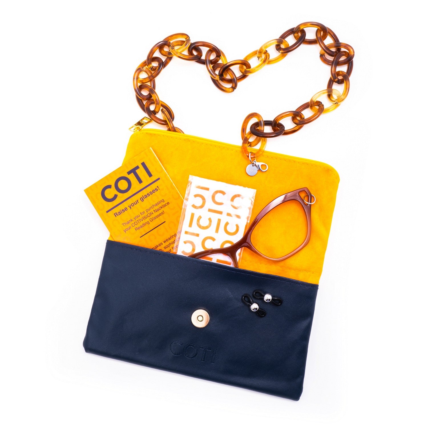 Cara Necklace reading glasses have been designed to be worn around the neck and lifted when needed to read the small print. A handy and convenient alternative to traditional reading glasses. All Coti Necklace Reading Glass Kits come with: reading glass front, chain, silicone ends so the chain can also be used with traditional glasses, all in a unique case to hold all elements.