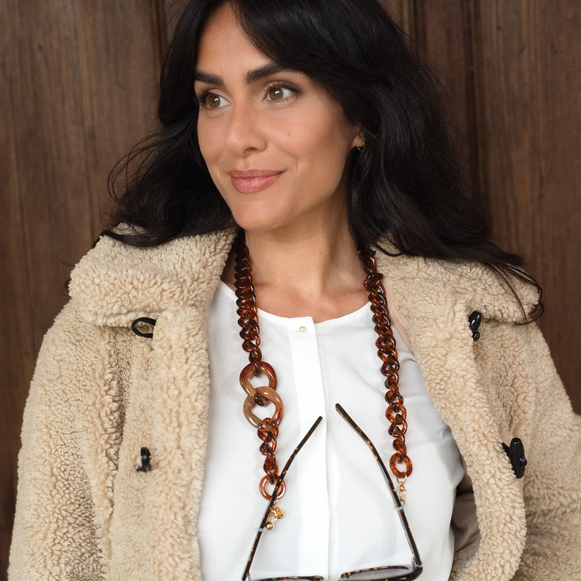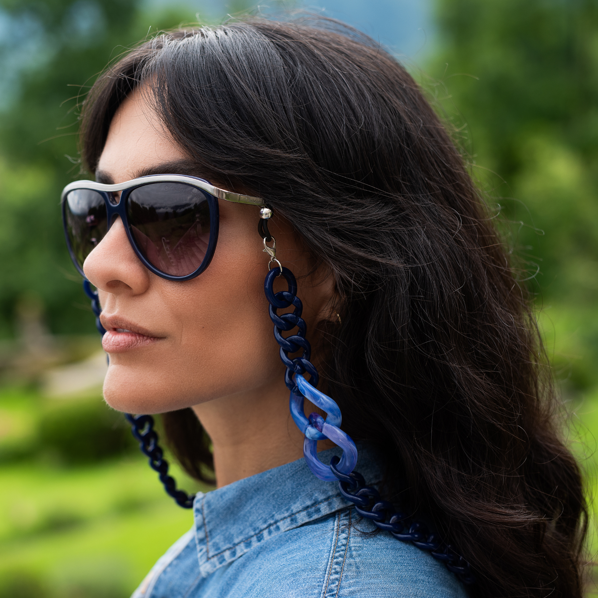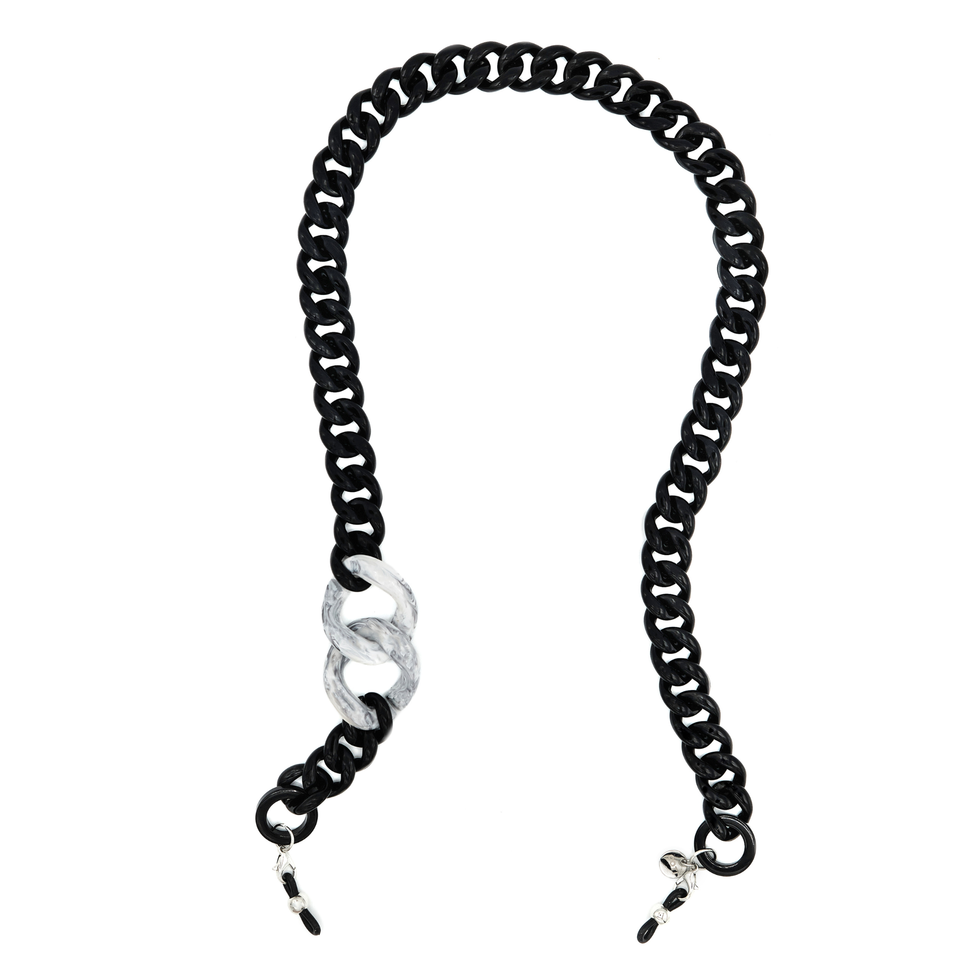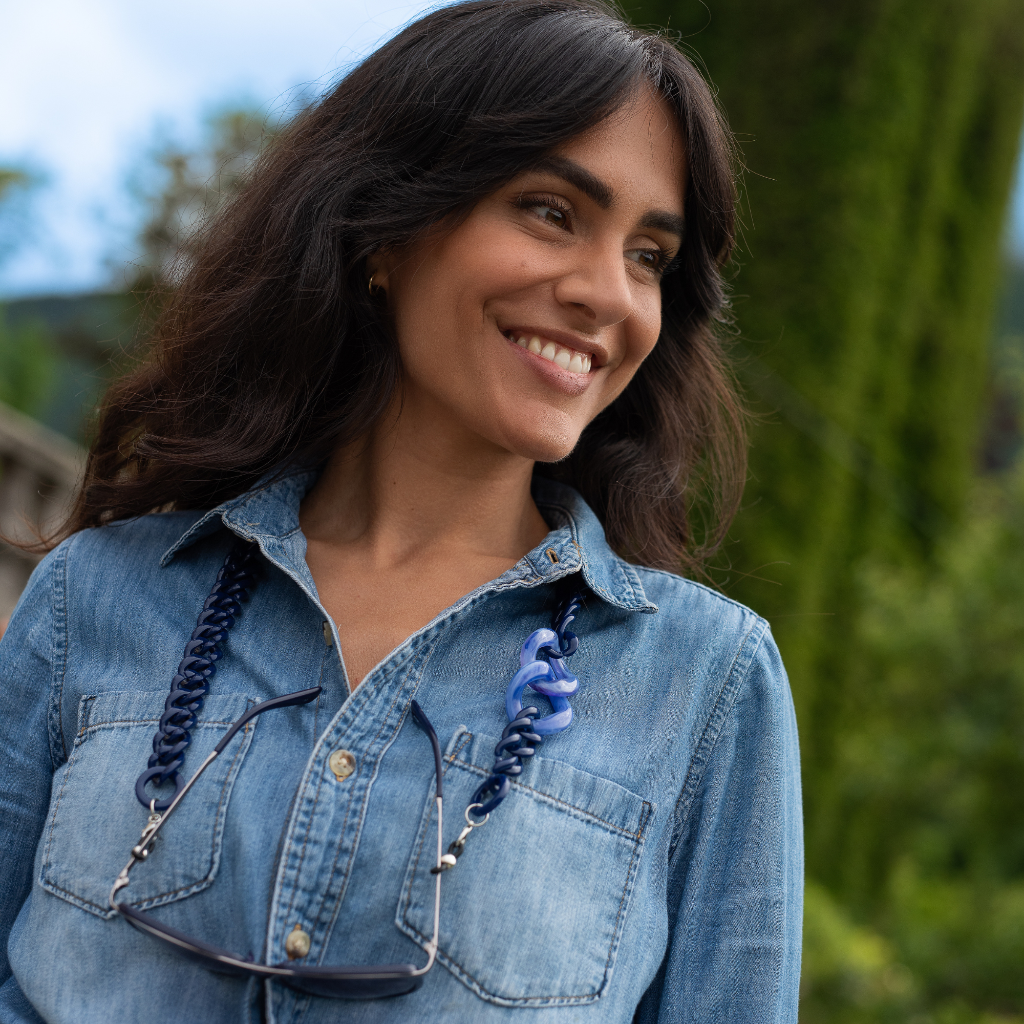 To attach the glasses chain to your frame, place the silicone loops located at each end of the chain onto the temples of your glasses. Push the small metal slide on the loop to tighten it securely to the temple. Additional ends available to purchase separately CLICK HERE