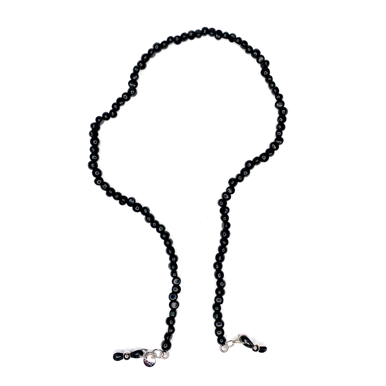 To attach the glasses chain to your frame, place the silicone loops located at each end of the chain onto the temples of your glasses. Push the small metal slide on the loop to tighten it securely to the temple. Additional ends available to purchase separately HERE.