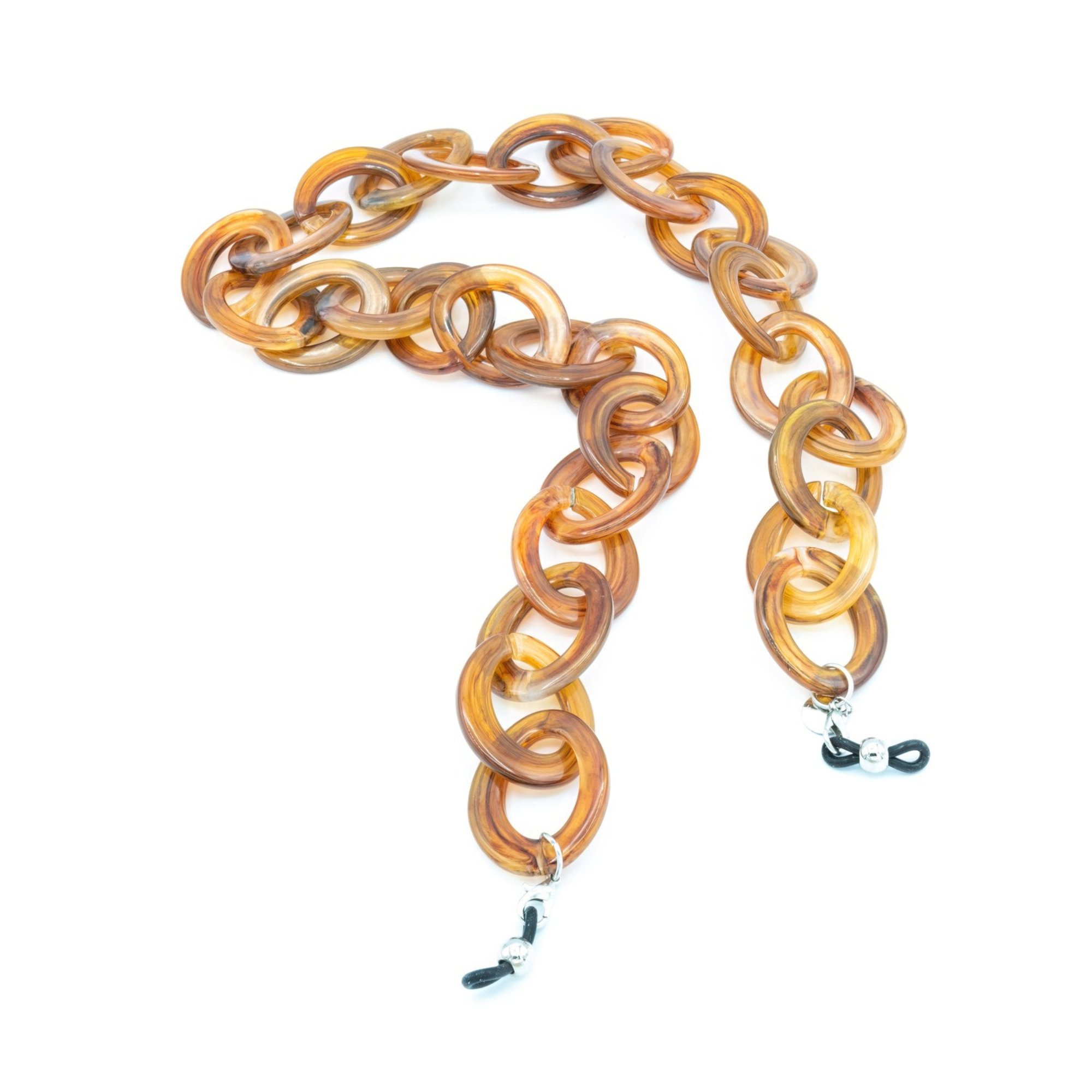 To attach the glasses chain to your frame, place the silicone loops located at each end of the chain onto the temples of your glasses. Push the small metal slide on the loop to tighten it securely to the temple. Additional ends available to purchase separately HERE.