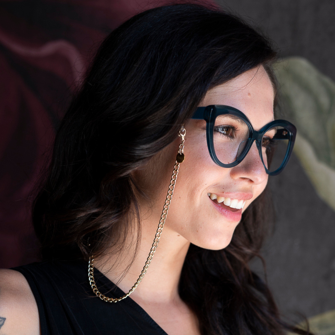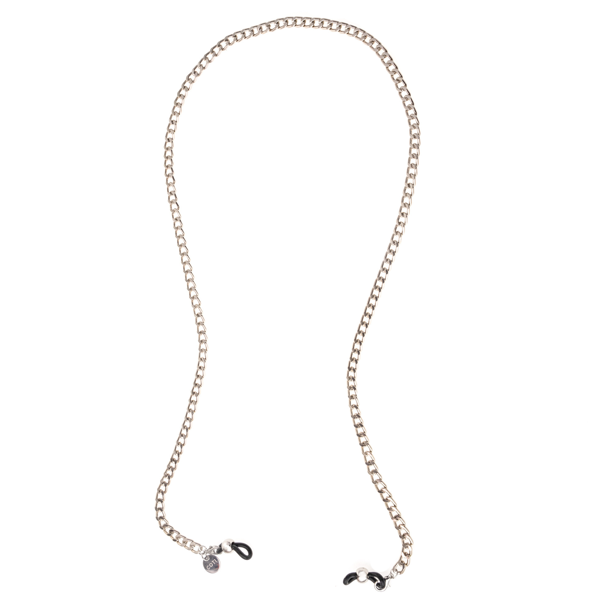 To attach the glasses chain to your frame, place the silicone loops located at each end of the chain onto the temples of your glasses. Push the small metal slide on the loop to tighten it securely to the temple. Additional ends available to purchase separately HERE.