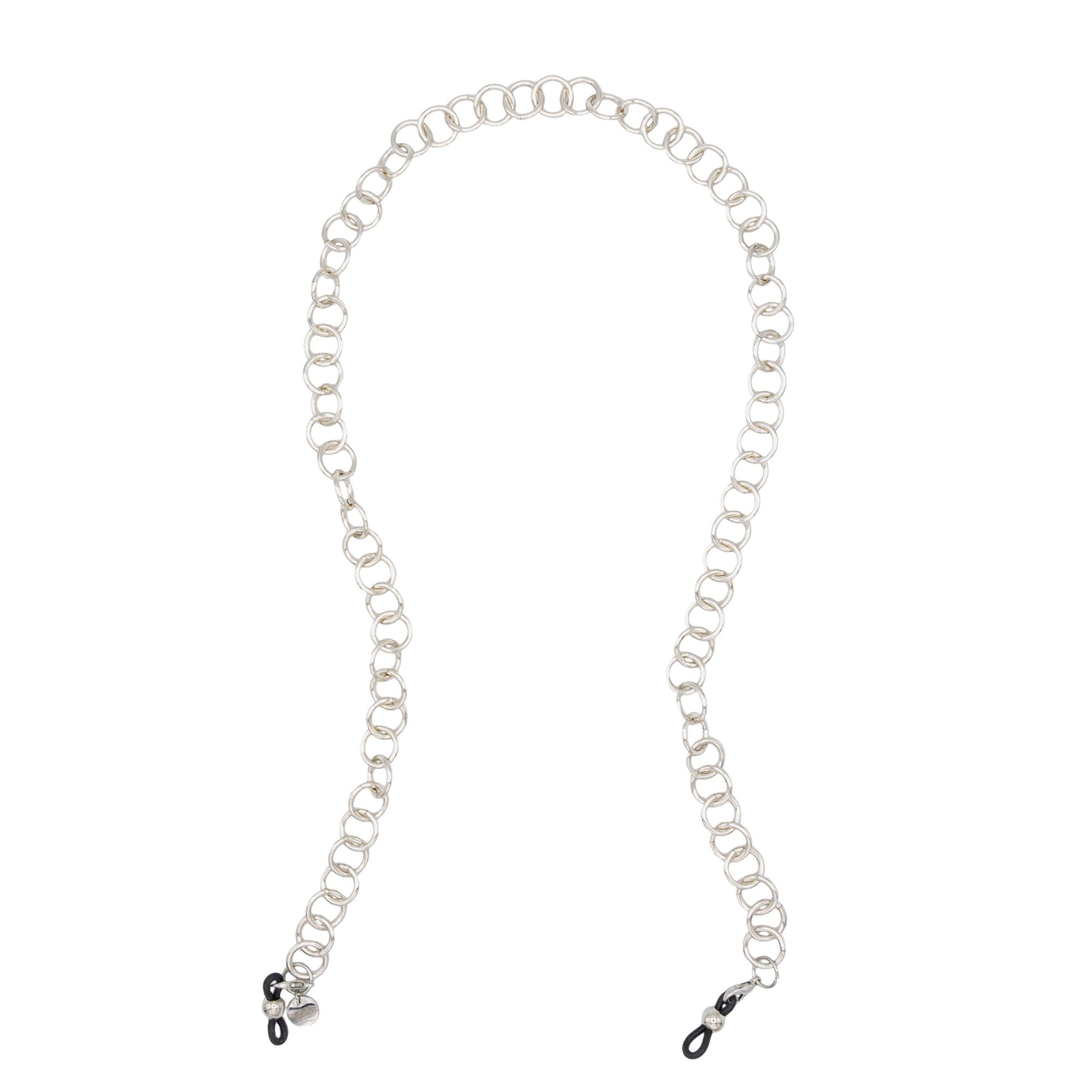 To attach the glasses chain to your frame, place the silicone loops located at each end of the chain onto the temples of your glasses. Push the small metal slide on the loop to tighten it securely to the temple. Additional ends available to purchase separately HERE.